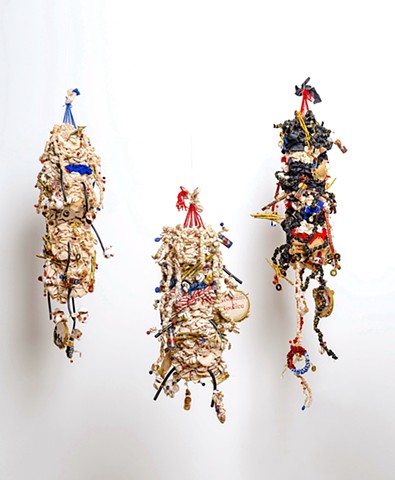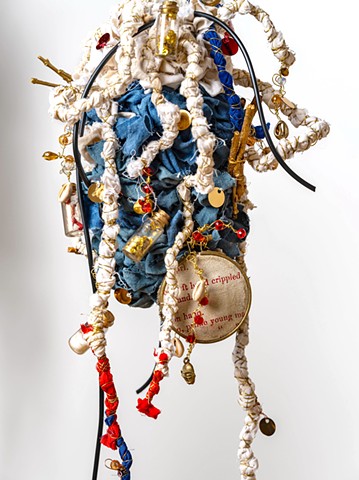 Page 15 is an installation comprising seven textile-based sculptures and is part of my ongoing project 436. The work is informed by the final page of an 1859 slave auction catalog. Due to the time-induced decay of this archival document, the names of the last seven enslaved people sold through one of the largest recorded slave auctions in U.S. history have faded from documented memory. Only twenty scattered words remain on the catalog’s final page. Through this work, I reimagine and pay homage to these seven individuals whose stories have been lost to history.